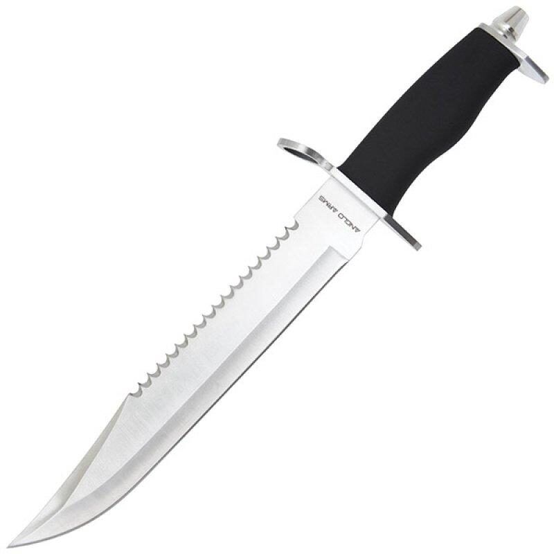 The Anglo Arms, 574-15, is a large clip point fixed blade hunting knife constructed from 440 stainless steel with a rat tail tang and a razor sharp blade that utilizes a 230mm cutting edge with a 14mm v-grind. The 574-15 has a 3mm saw back spine designed to cut through branches, rope and bone with ease, the clip point blade means it's ideal for digging and prising.